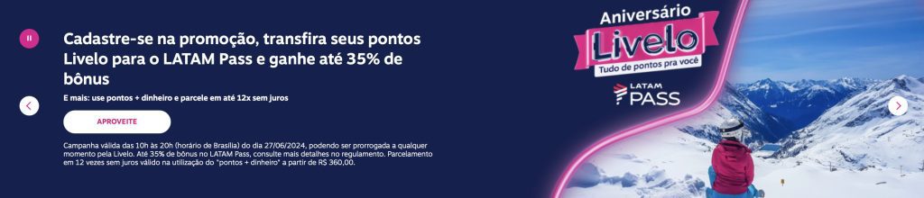 Incremente seus pontos no Clube LATAM Pass! Transfira da Livelo e ganhe até 35% de bônus. Oferta por tempo limitado, até às 20h de hoje.