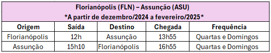 Além disso, a rota Florianópolis – Assunção terá dois voos semanais, às quartas e aos domingos. Os voos decolarão de Florianópolis às 12h e pousarão em Assunção às 13h55. No sentido inverso, os voos sairão da capital paraguaia às 15h10 e chegarão em Florianópolis às 16h55.