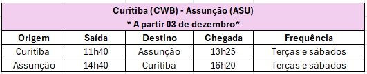 Além disso, a rota Curitiba – Assunção, que começa a operar em 3 de dezembro, será realizado duas vezes por semana, às terças e sábados.