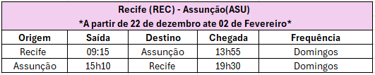 A nova rota Recife – Assunção operará durante a alta temporada, de 22 de dezembro a 2 de fevereiro. Os voos partirão de Recife às 09h15 aos domingos, com chegada à capital paraguaia às 13h55. Além disso, o retorno dos voos para o Brasil sairá às 15h10 e pousará em Recife às 19h30