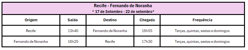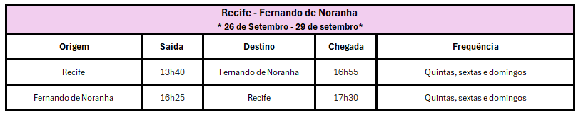 Para setembro, a Azul anunciou voos extras na rota Recife–Fernando de Noronha, entre os dias 17 a 22, haverá operações adicionais nas terças, quintas, sextas e domingos. Os voos partirão de Recife às 13h40, chegando em Fernando de Noronha às 16h25, com retorno às 16h55 e chegada em Recife às 17h30. Já entre 26 a 29 de setembro, os voos extras ocorrerão às quintas, sextas e domingos, com os mesmos horários.