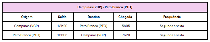 O voo inaugural partiu de Campinas às 13h20 e aterrissou em Pato Branco às 15h05. No retorno, o avião decolou às 15h35 e chegou a Viracopos às 17h20. Operada pelo modelo ATR 72-600, que possui capacidade para 70 passageiros, a rota oferece conforto e praticidade para os viajantes entre as duas cidades.