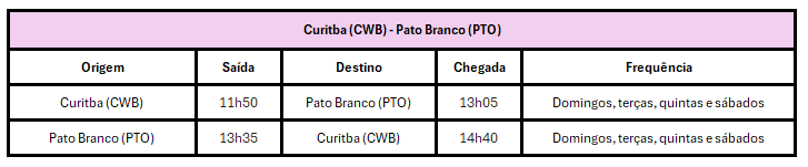 Além da recém-inaugurada rota entre Campinas e Pato Branco, a cidade paranaense no sudoeste também oferece quatro voos semanais para Curitiba. As decolagens ocorrem assim, aos domingos, terças, quintas e sábados, em aeronaves ATR 72-600, partindo do Aeroporto Internacional Afonso Pena, em Curitiba, às 11h50, com pouso em Pato Branco às 13h05. No sentido inverso, os voos saem de Pato Branco às 13h35, chegando à capital às 14h40.