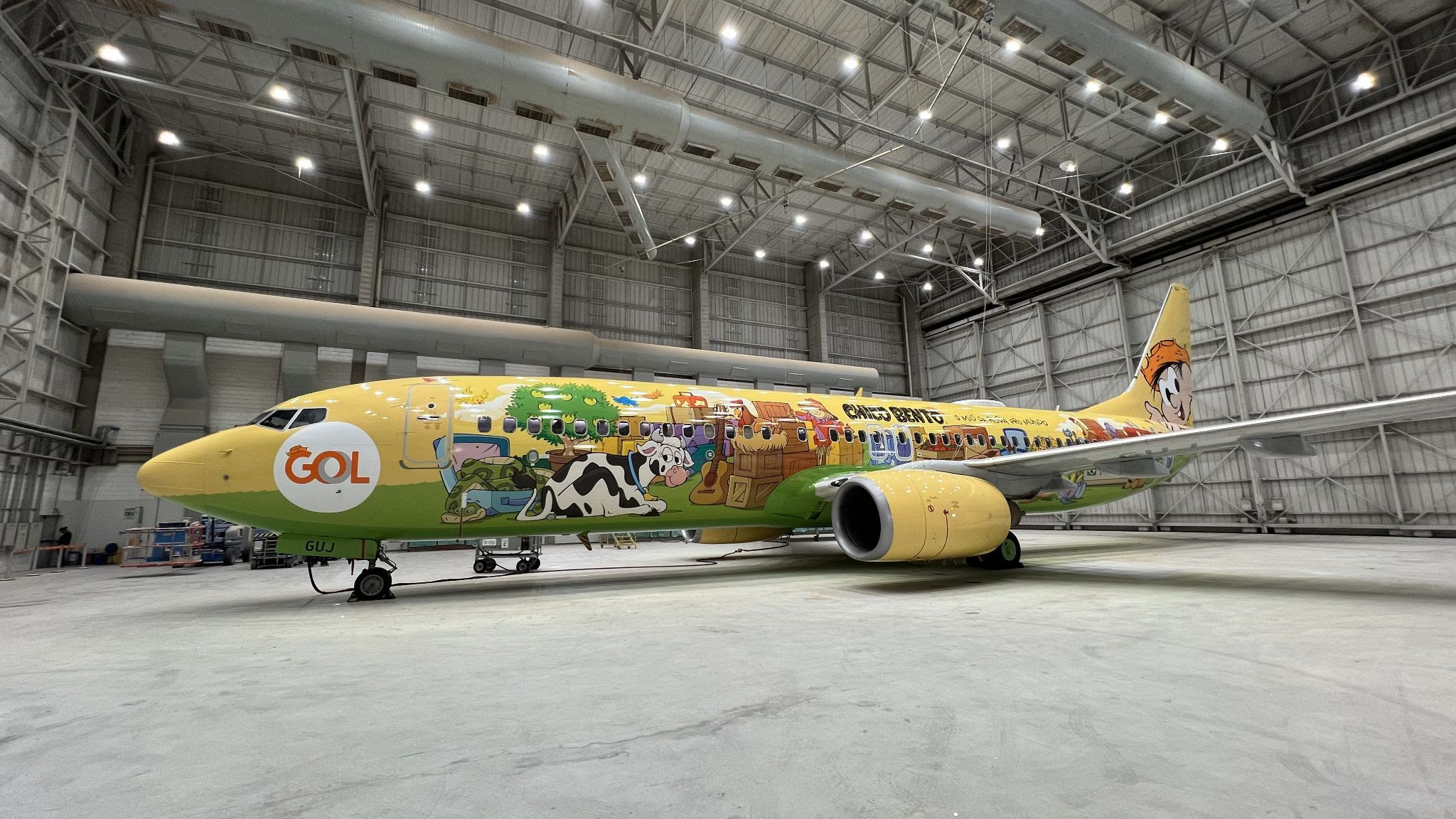O Boeing 737-800, prefixo PR-GUJ, foi meticulosamente decorado tanto interna quanto externamente, trazendo à vida Chico Bento e sua turma, incluindo Rosinha, Zé Lelé e Nhô Lau, com artes exclusivas. Além disso, mais de 35 colaboradores de Marketing, Pintura, Engenharia de Estruturas e Comunicação Visual dedicaram-se a proporcionar uma experiência de viagem acolhedora e divertida.