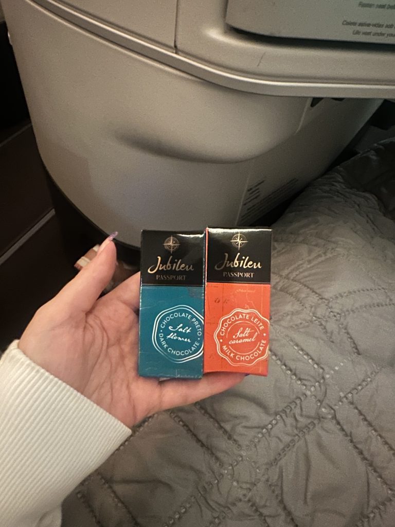 Após recolherem o jantar, passaram oferendo um chocolate aos passageiros, o comissário que me atendeu, muito simpático me deu dois chocolates, e estes eram muito bons.