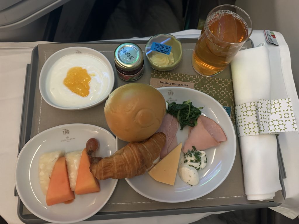 1 hora e 30 minutos antes do pouso, serviram o café da manhã, que não estava descrito no cardápio, mas foi servido frutas, iogurte, geleia de goiaba, manteiga, e uma seleção de queijos e presuntos. Também passaram servindo pães e croissants.