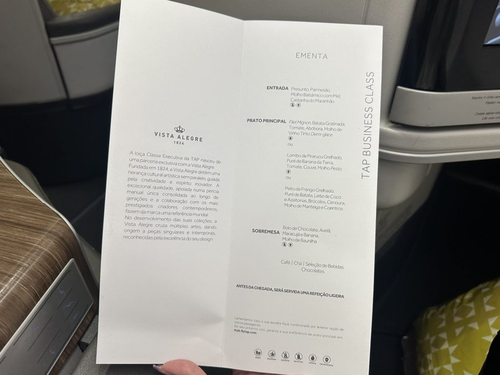 Após a decolagem, os comissários passaram retirando os pedidos para o jantar, abaixo o cardápio com as opções disponíveis: