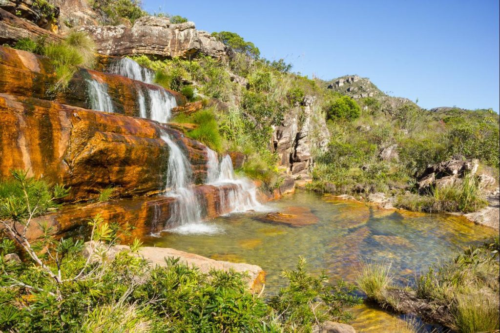 A Chapada dos Veadeiros, situada no estado de Goiás, encanta os visitantes com suas cachoeiras e piscinas cristalinas, como a deslumbrante Santa Bárbara, além de cânions e formações rochosas com mais de um bilhão de anos, como o Vale da Lua.