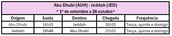 A nova rota será operada às terças, quintas e domingos, de 1º de setembro a 26 de outubro. O voo EY311 decolará de Abu Dhabi às 14h10 e chegará a Jeddah às 16h10. No retorno, o voo EY312 partirá de Jeddah às 18h40 e pousará em Abu Dhabi às 22h25.