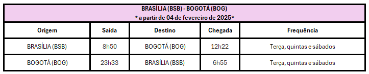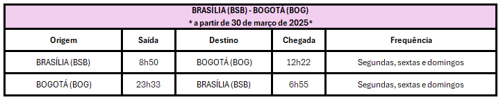 A GOL Linhas Aéreas iniciou a venda de passagens para a nova rota entre Brasília (BSB) e Bogotá (BOG). A operação começa em 4 de fevereiro de 2025, com três frequências semanais às terças, quintas e sábados. A partir de 30 de março, os voos passarão a operar às segundas, sextas e domingos.