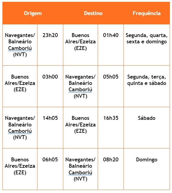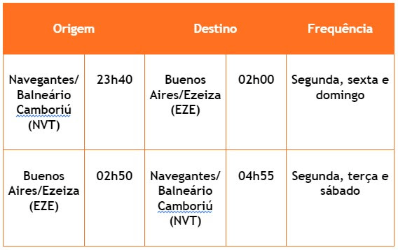 Entre o início de 2024 ao Carnaval (17/02), serão 5 frequências entre as duas cidades. Saídas de Navegantes terão voos noturnos e meio da tarde disponíveis. Já os voos saindo de Buenos Aires serão entre a madrugada e início da manhã.