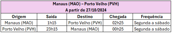 A partir de 27 de outubro, a GOL retomará os voos diretos entre Manaus, no Amazonas, e Porto Velho, em Rondônia, com operações de segunda a sábado. Sendo assim, com essa nova rota Manaus (MAO) – Porto Velho (PVH), a companhia reforça a integração regional, conectando as duas capitais sem escalas.