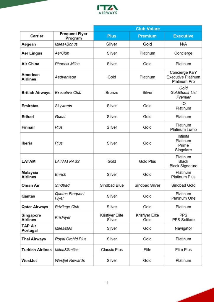 A ITA Airways também está oferecendo a chance de equiparar o status match com outros 19 programas de fidelidade. Confira a abaixo:
